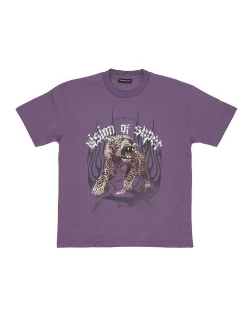 Elevate your casual style with this Vision OF Super oversized fit T-Shirt for men. Featuring the brand's logo embroidered on the back label and a screen printed Gothic version on the front, this tee also includes flames logo embroidery on the back label. Made from 100% Cotton, this tee is both hand and machine washable. Get yours now! Colour: purple