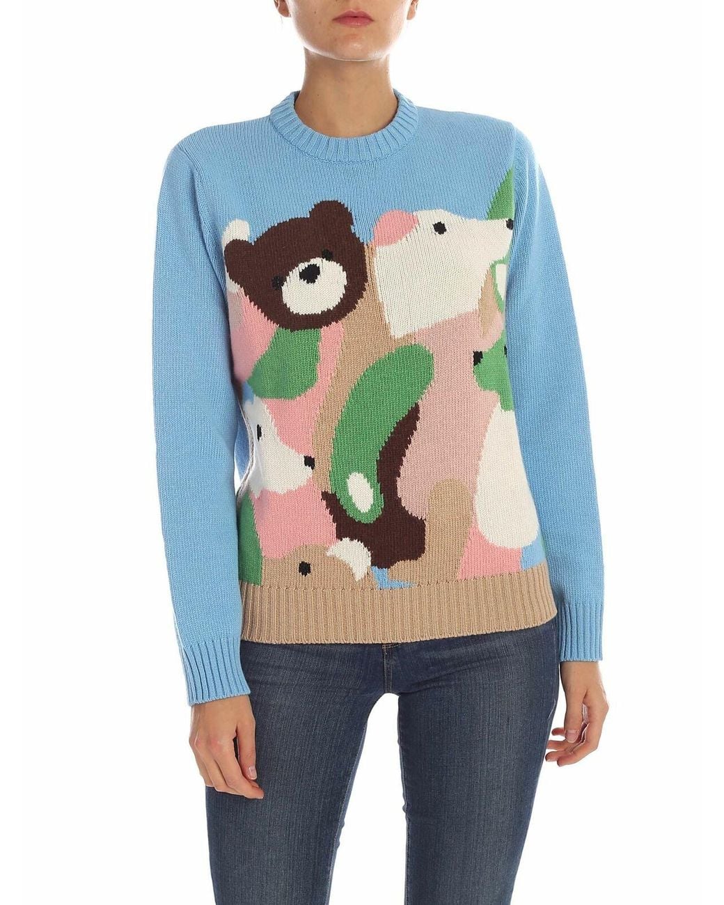 Crewneck pullover in viscose wool and cashmere Color: light blue Multicolour front intarsia Black lamé details Ribbed edges Colour: blue
