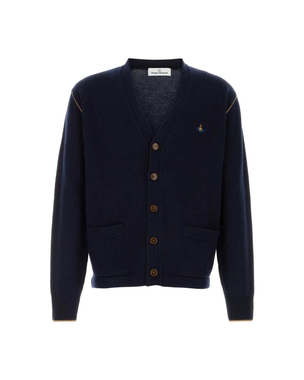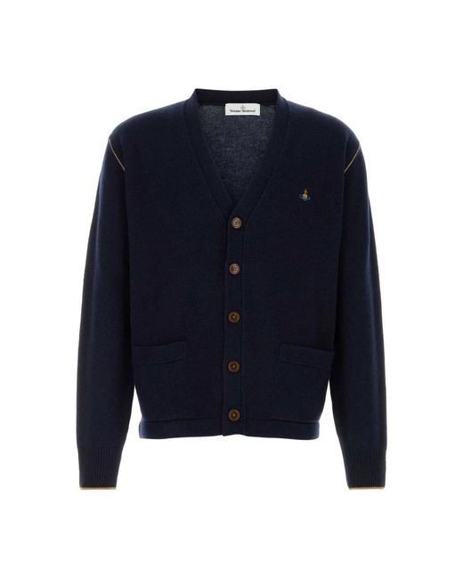 Vivienne Westwood Alex Cardigan is a signature knit crafted in a wool-cashmere blend, offering a soft, lightweight layer finished with the brand's embroidered orb detail. Key attributes: Navy blue | Wool-cashmere blend | Lightweight knit | Insulating warmth | Button-front fastening | Two front pockets | V-neckline | Ribbed trims | Embroidered orb motif on chest | Straight hem | Long sleeves | Dimensions & fit: Fits true to size | Roomy body | Composition & care: 90% wool | 10% cashmere | Dry clean recommended. If washing, wash separately; do not bleach; avoid tumble drying and prolonged direct heat; iron inside out following label instructions. Colour: blue