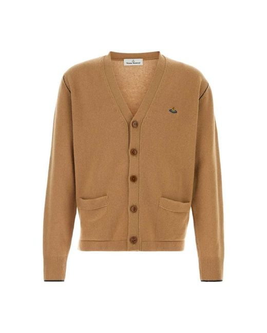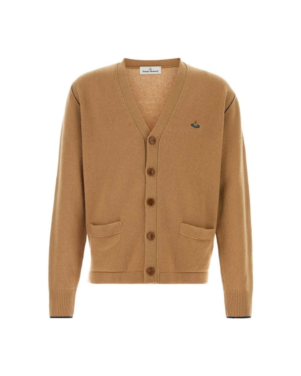 Vivienne Westwood Alex Cardigan is a V-neck button-front cardigan crafted in a wool-cashmere blend, designed for layered warmth and everyday polish. Key attributes: Brown | Camel | Wool-cashmere blend | Lightweight | Soft hand feel | Button-front fastening | Two front pockets | V-neckline | Contrasting piping on shoulders and sleeves | Embroidered orb motif on chest | Ribbed trims | Straight hem | Long sleeves | Dimensions & fit: Fits true to size | Roomy body | Composition & care: 90% Wool | 10% Cashmere | Wash separately; do not use bleach. Avoid tumble drying and prolonged exposure to direct sunlight or heat. Iron inside out or with a cloth. Protect metal accessories when washing. Professional dry clean recommended. Colour: brown