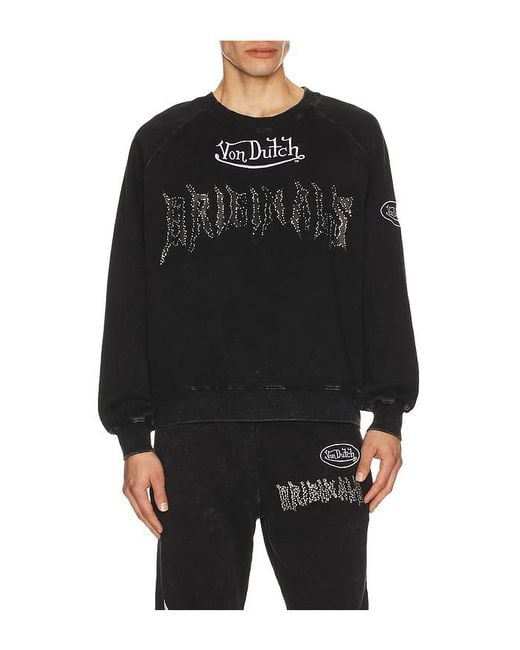 Von Dutch Crew Neck Raglan Sweatshirt in Black. Size L. Also in M, S, XL/1X. Von Dutch Crew Neck Raglan Sweatshirt in Black. Size M, S, XL/1X. 70% cotton 30% polyester. Machine wash. Pull-on styling. Front and back graphic. Midweight fleece fabric. VON-MK6. 4VND5A3155RV. You've seen it on all your favorite celebs, on their heads, on their denim, and now on their tees. The Von Dutch signature tee is the purest Von Dutch can get.