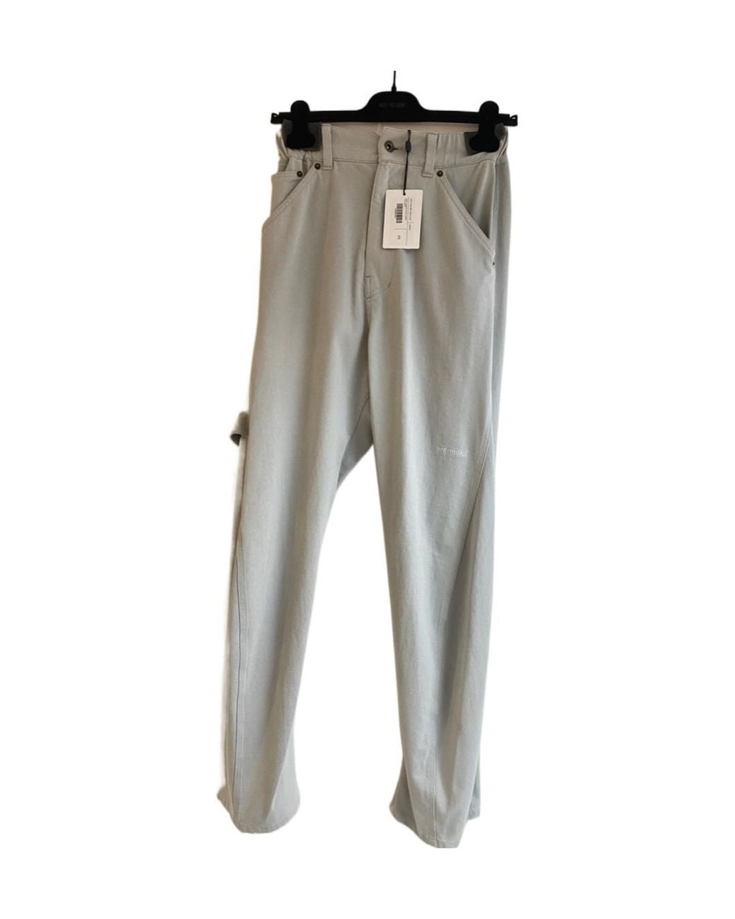 Twisted outer seam, belt loop at elastic waist belt, multi-pocket design, lid zipper placket, hammer loop at side seam, logo embroidery on front, overall faded, worn and wrinkled. Colour: grey