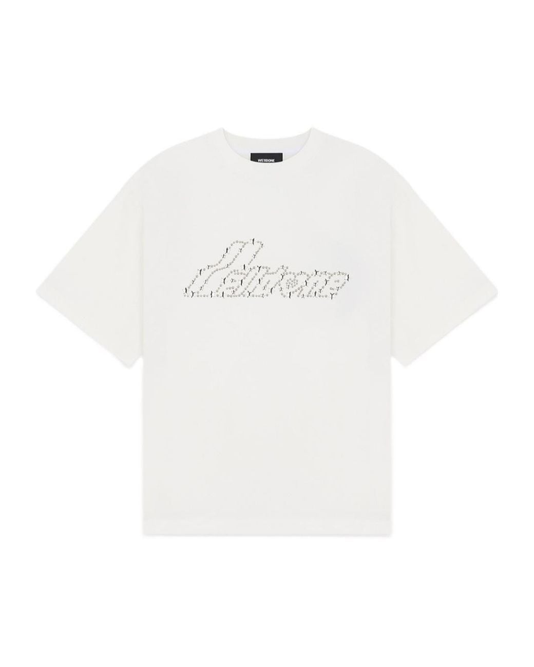 Rib knit crewneck collar, logo detailing at chest, stud and faux pearl detailing, and dropped shoulders. Colour: white