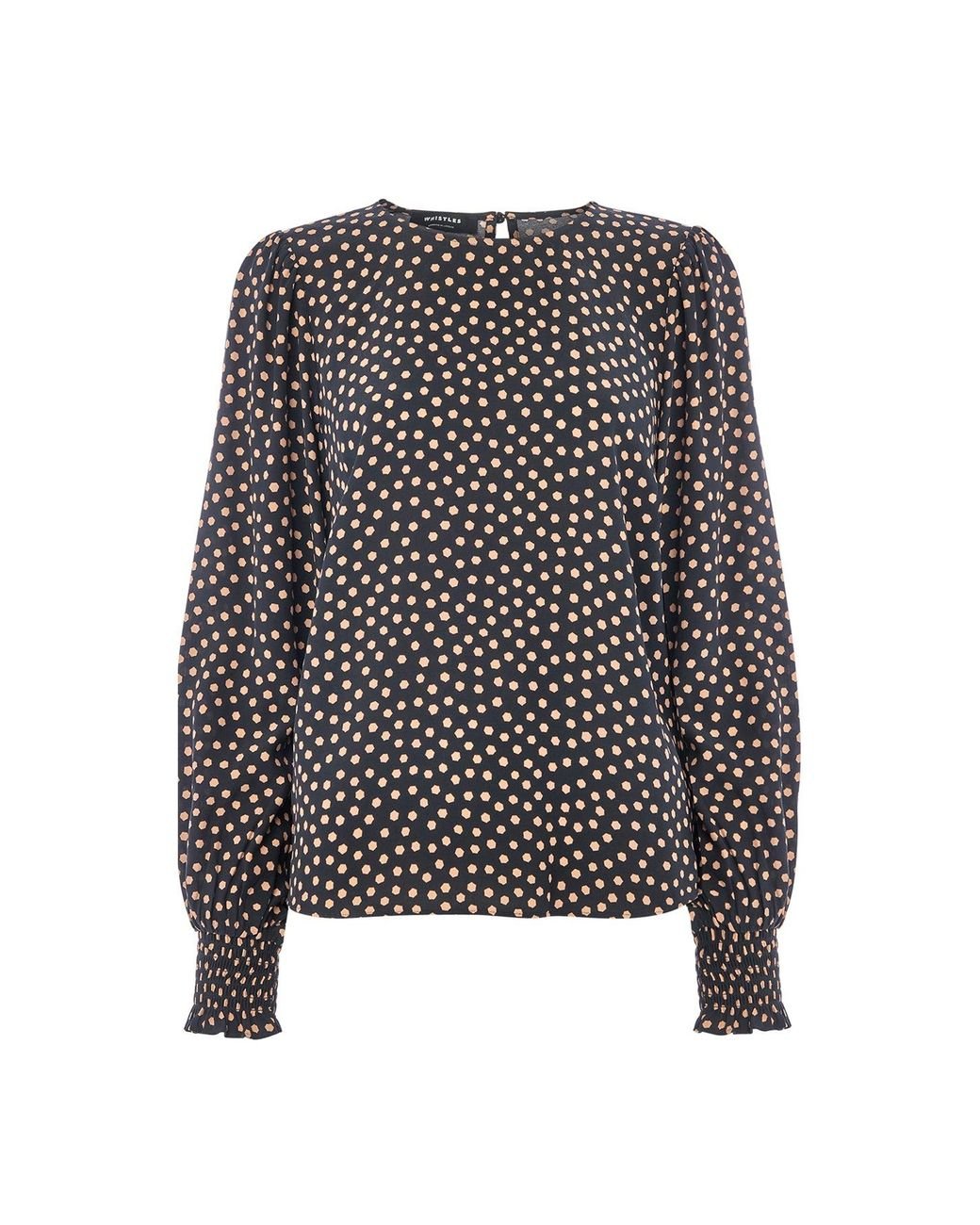 Women's Black Spot Shirred Cuff Blouse, Wood/Metal