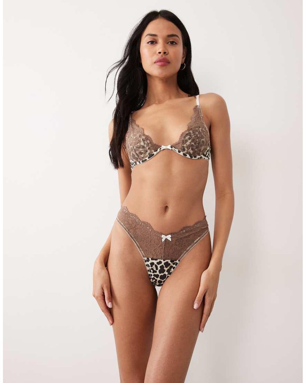 Esme Lace Trim Dipped Front Thong - Brown