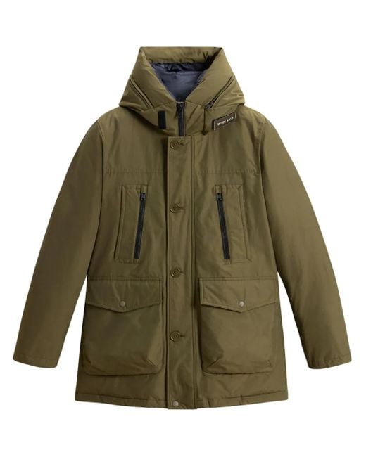 Light olive green cotton blend duck down padded design water-resistant front button and zip fastening classic hood appliqué logo long sleeves two diagonal pockets to the sides two front flap pockets quilted lining straight hem Size: XS. Gender: Male. Material:Cotton/Polyamide/Duck Down/Feather/Polyamide. Colour: green