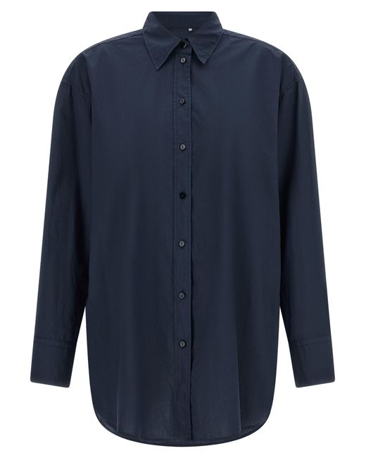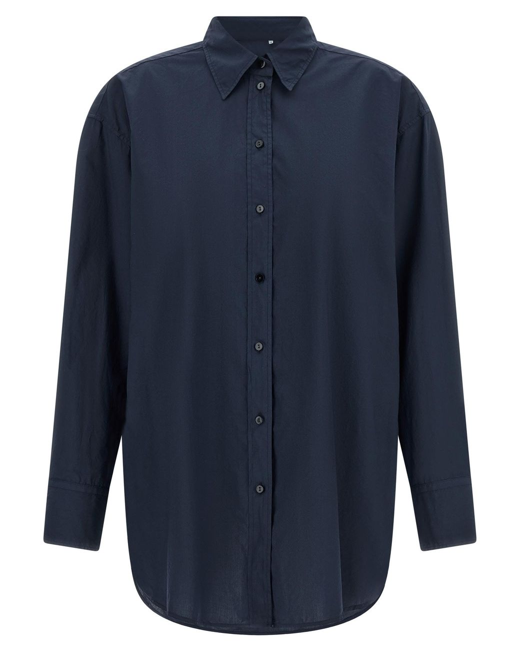 'Tessa' cotton poplin shirt, pointed collar, front mother-of-pearl button closure, long sleeves with cuffs and dropped shoulders, rounded and asymmetrical hem. Composition: 100% cotton Colour: blue