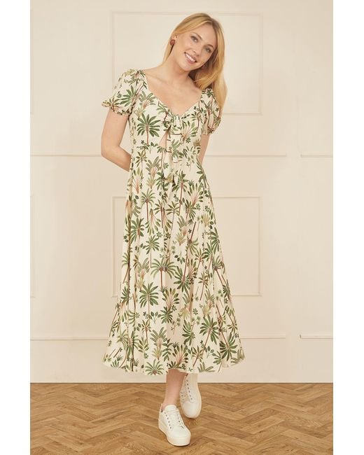 - Cotton Palm Print Ruched Midi Dress