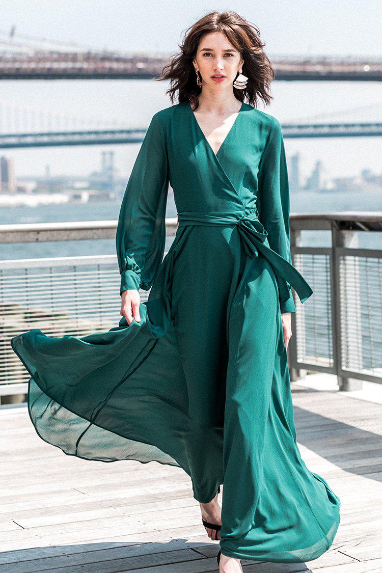 A full skirt complements the elegant, flowing silhouette of our Giselle Green Maxi Dress. Details include attached belt, a wrap bodice, buttons on cuff, snap closure on neckline, and hidden back zipper. Dry Clean Only *Model is wearing a size small FABRIC: 100% Polyester LENGTH: Top of shoulder to hem 60" #DR-3502M. Colour: green