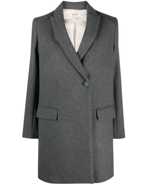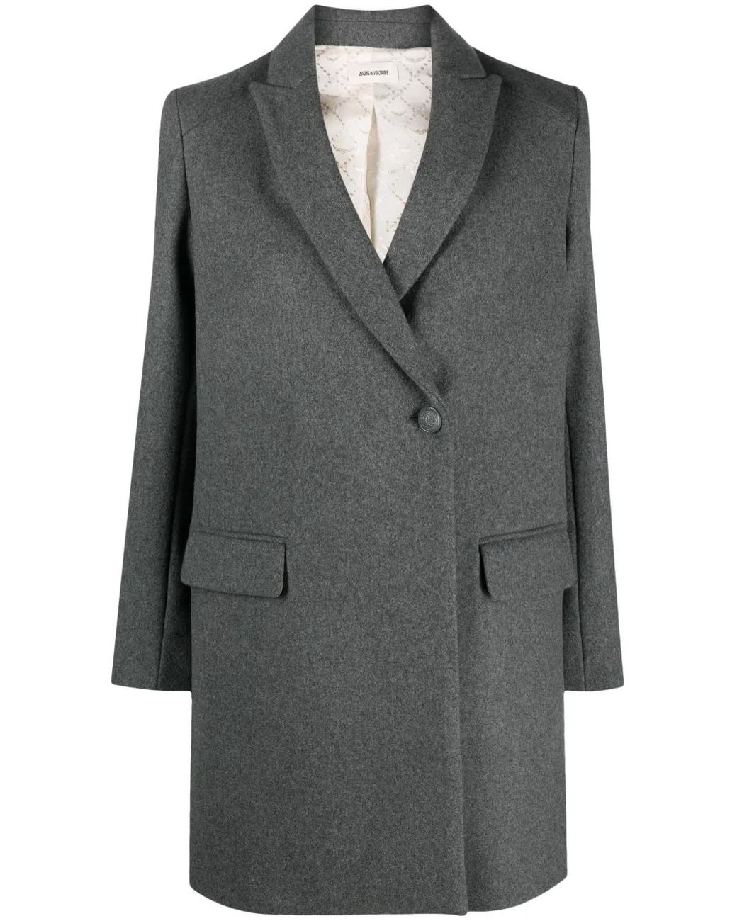 Charcoal grey recycled wool blend peak lapels shoulder pads long sleeves front button fastening two side flap pockets satin lining straight hem Size: M. Gender: Female. Material:Polyester/Polyamide/Recycled Wool/Acetate/Acetate/Viscose. Colour: grey