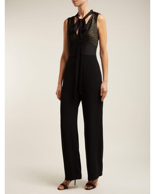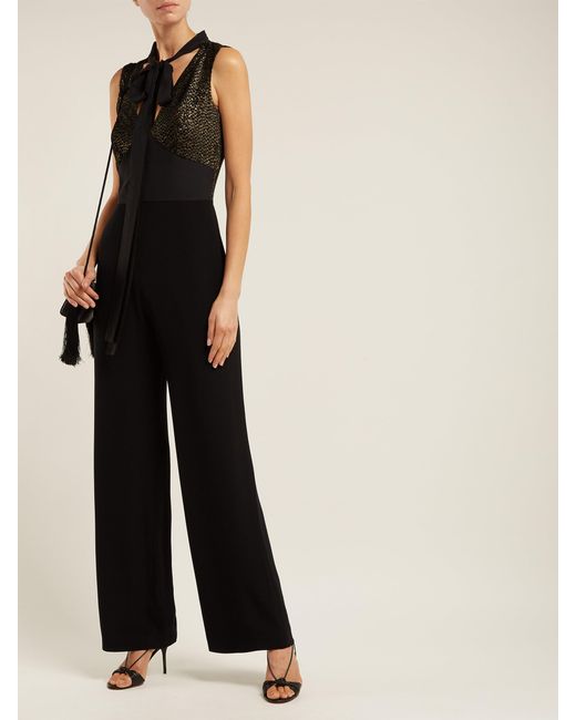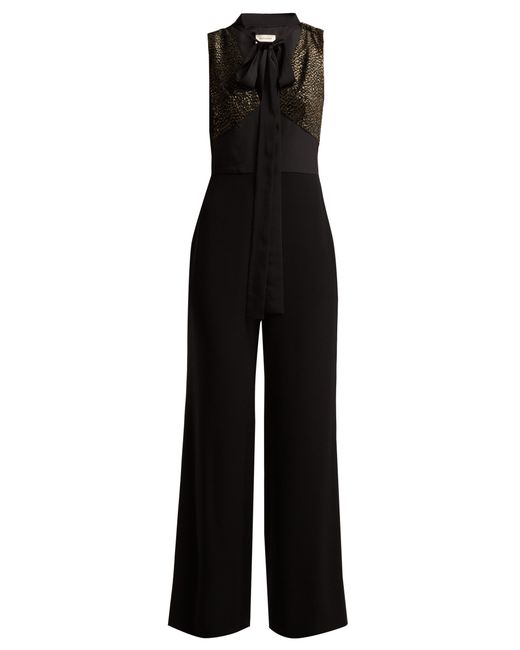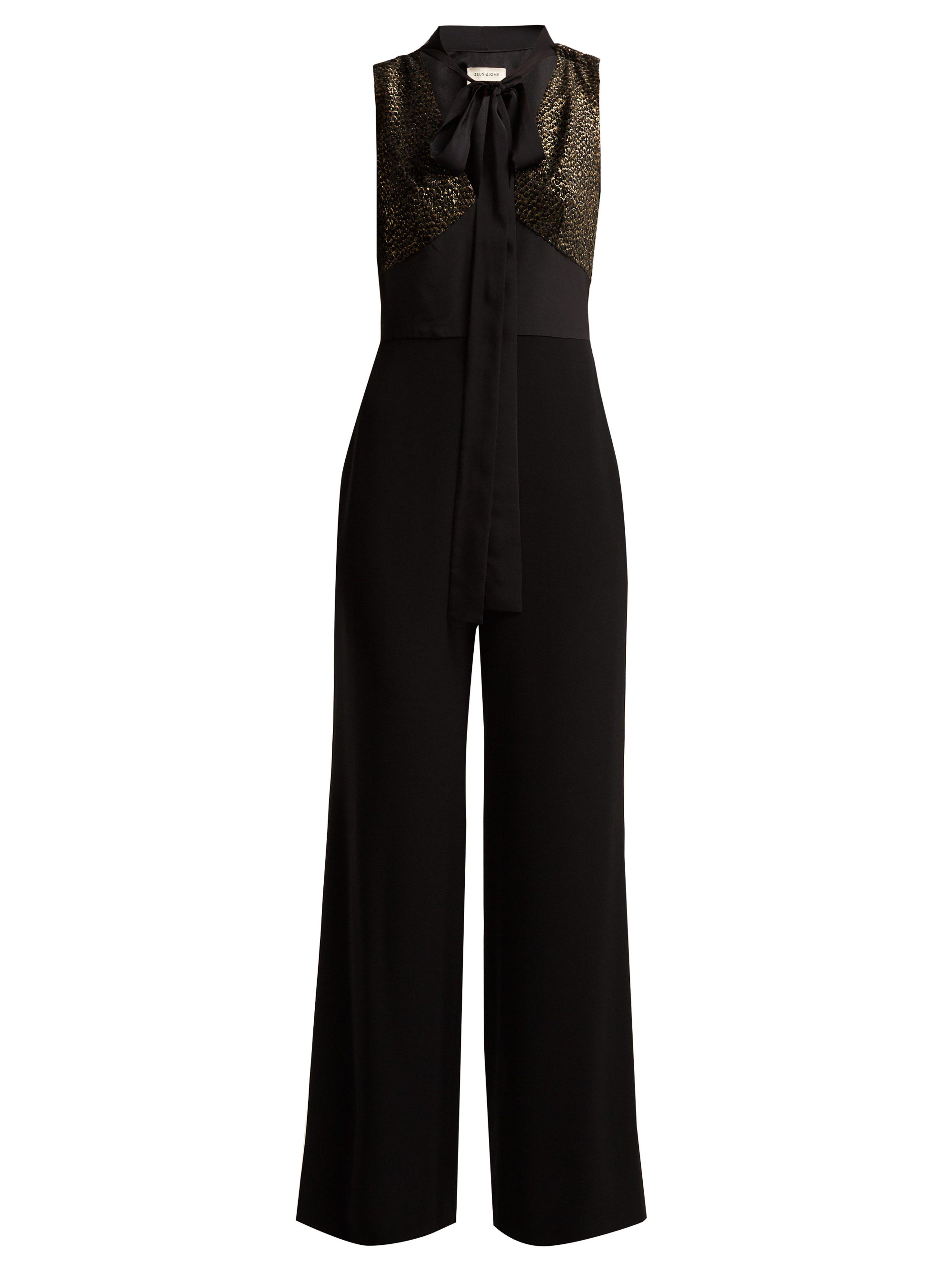 Inspired by Greek history, Zeus + Dione creates this black Hypatia jumpsuit in honour of the Hellenistic philosopher of the same name. It's crafted in Greece to a flattering slim fit, accented by a snake-effect metallic bodice panels and pussy-bow neck ties. Style it with your favourite high heels for a striking alternative to an evening gown. COTTON. Colour: black