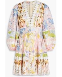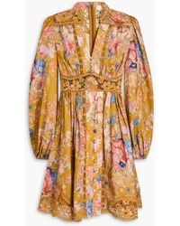 Zimmermann Women's Metallic Acacia Tie-Neck Broderie Anglaise-Trimmed Floral-Print Linen Mini Dress