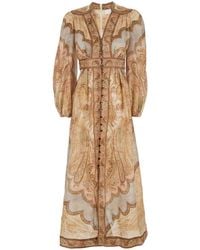 Discover the unique DRESS WITH POCKETS from the renowned brand ZIMMERMANN, whose designs combine elegance and artistic charm. This dress, in a dominant pink colour, adorned with pastel shades of purple, yellow, and blue, is the