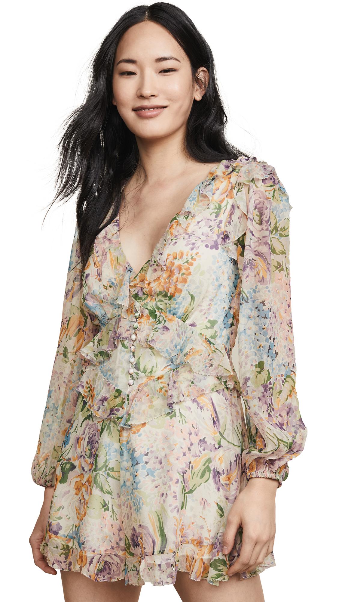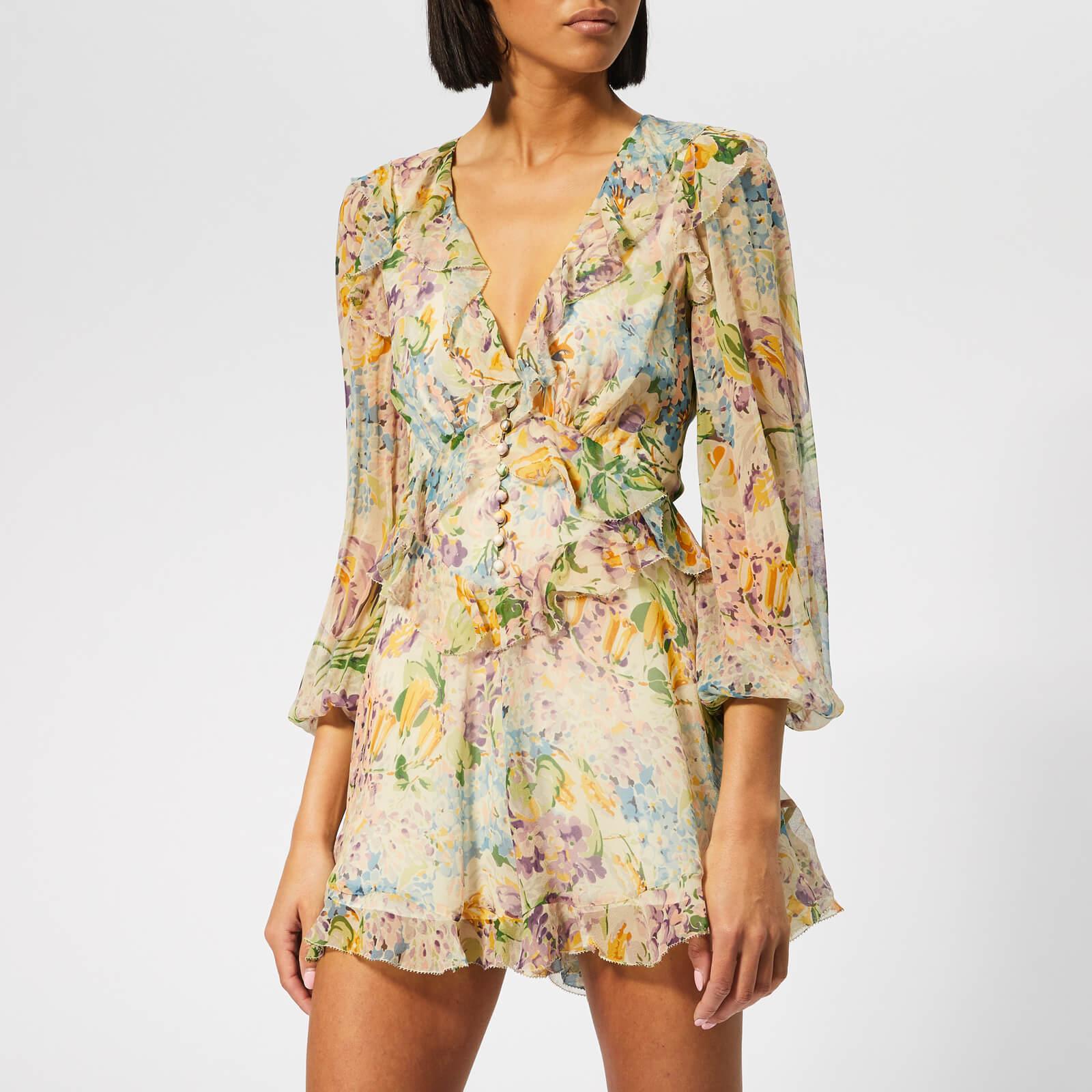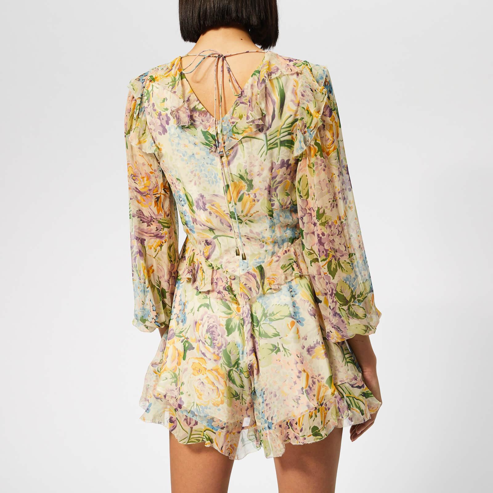 Beige silk tulip print playsuit from Zimmermann featuring a deep V neck, a deep V back, a ruffled design, long sleeves, a short length, decorative back tie and front button fastening. 100% SilkModel is 174cm/5'8.5 and wears a size 0/UK 8.