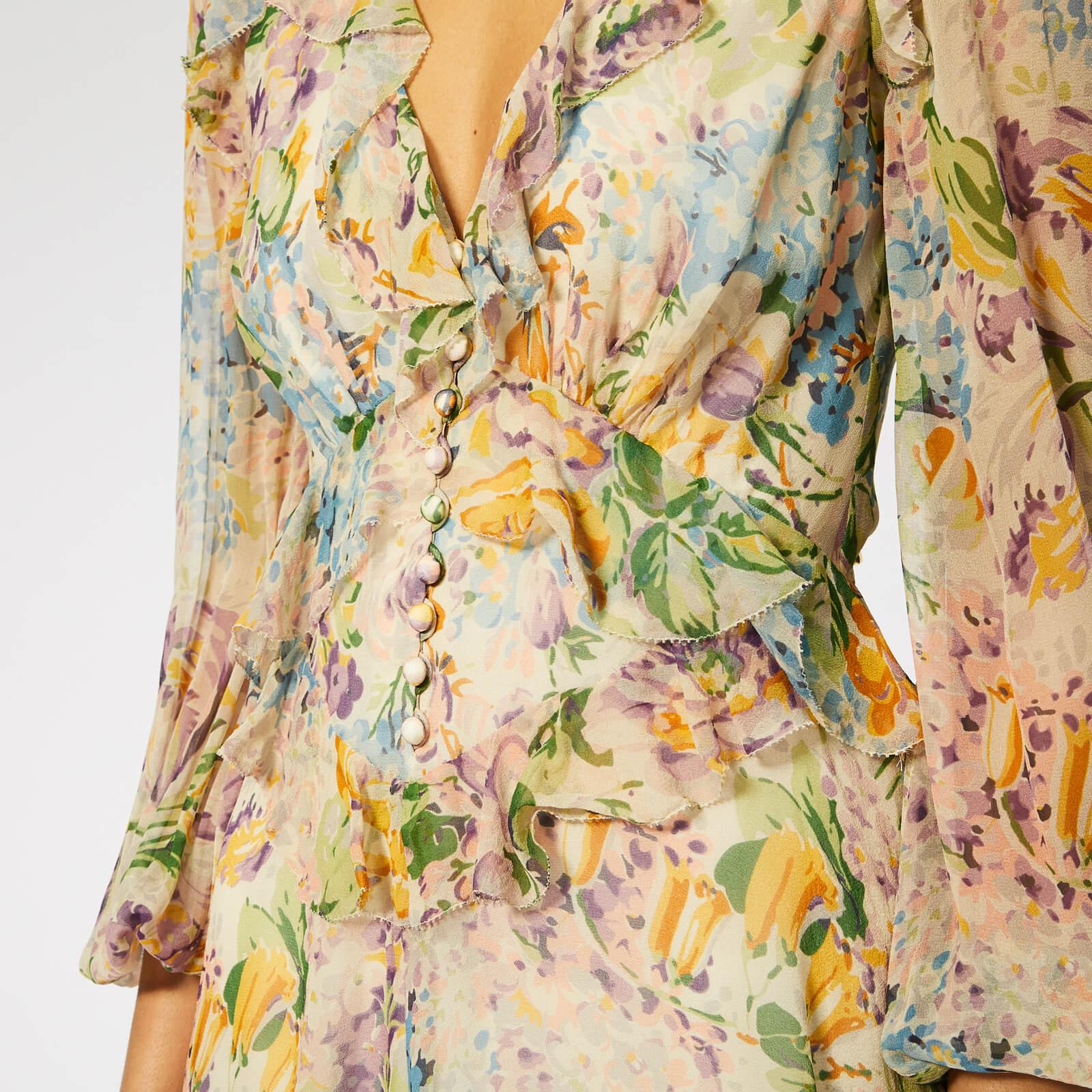 Fabric: Crepe. Ruffled detailing. Tie at neckline. Floral print. Button at front. Hidden zip at back. Shell: 100% silk. Lined. Lining: 100% viscose. Dry clean. Style #ZIMME41785. Inseam: 0.75in / 2cm.