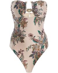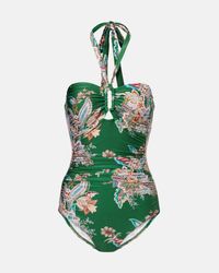 Go to Base BluZimmermann's Rhiannon Swimsuit features a triangle top with adjustable ties and a scrunched bottom with side ties for a customizable fit. The whole is embellished with a vibrant multicoloured paisley pattern, adding a