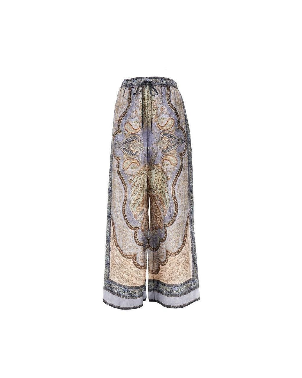 Trousers made from silk habotai with tapestry motif, featuring straight and wide leg. Adjustable elasticated waist with drawstring. Side inseam pockets. Colour: brown