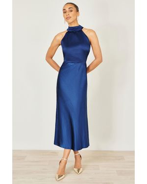 Satin Halter Neck Midi Dress - Blue