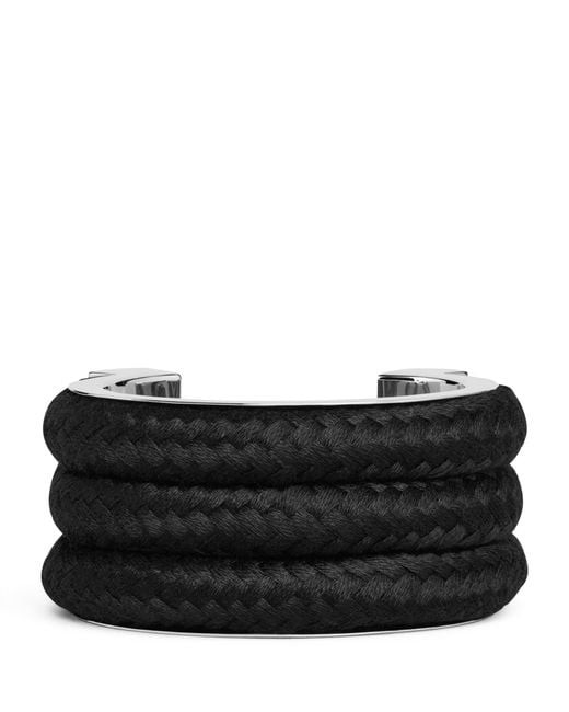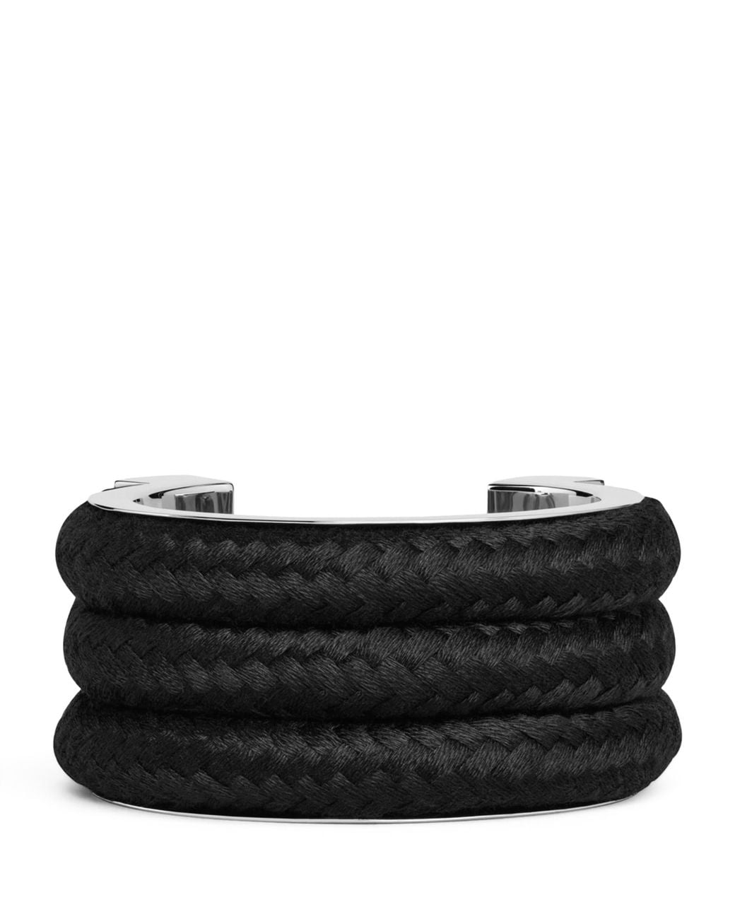 Texture and layering are everything to Alaïa – an ethos the label channels into this cuff bracelet. Set atop a shimmering silver-tone metal base, the piece features an experimental braided upper, woven from tonal cotton threads in a repeating herringbone pattern. Colour: black
