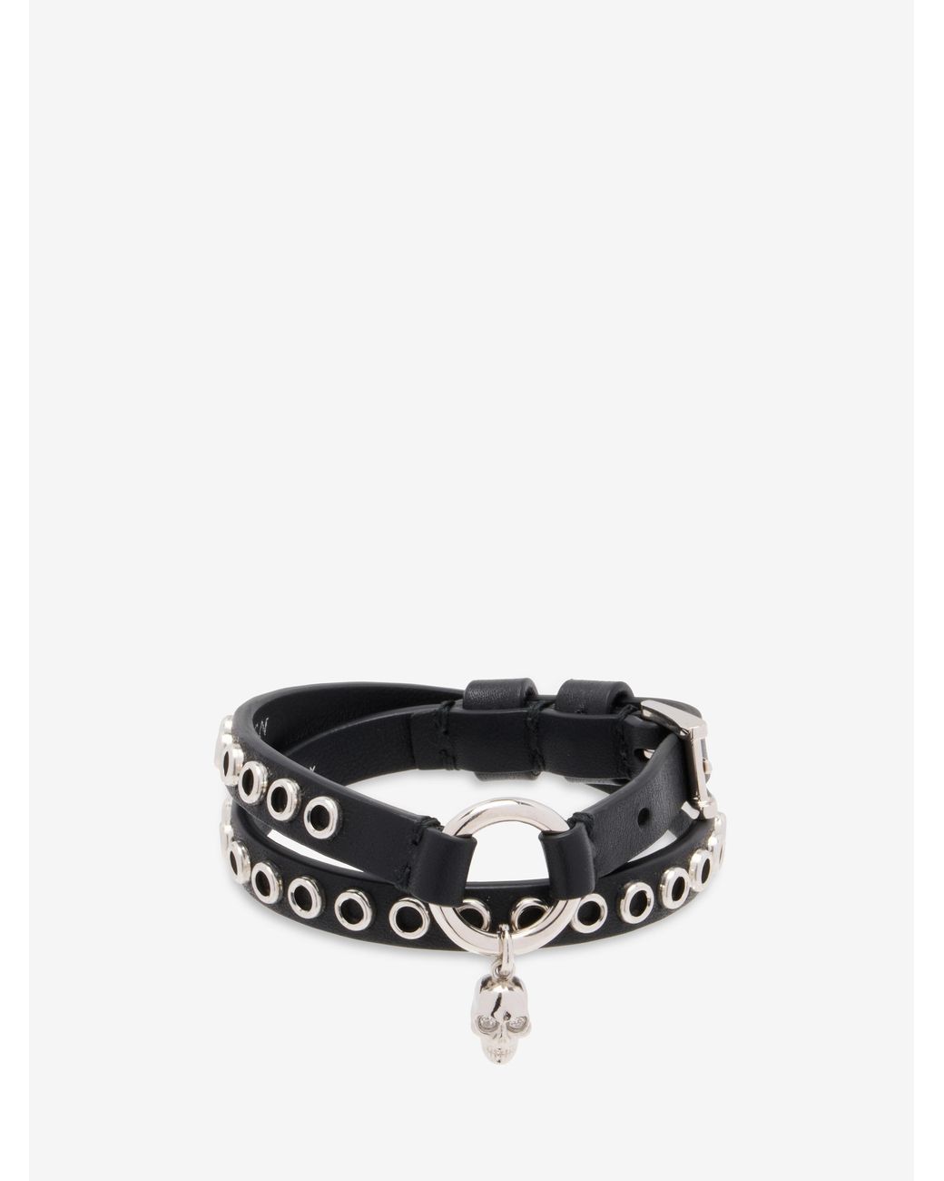 The skull ring double wrap bracelet – black calf leather with an embedded silver-finished ring, eyelet detailing and a hanging skull charm. Mcqueen foiled logo on the inside. Buckle closure with adjustable length. Brass hardware. Colour: white
