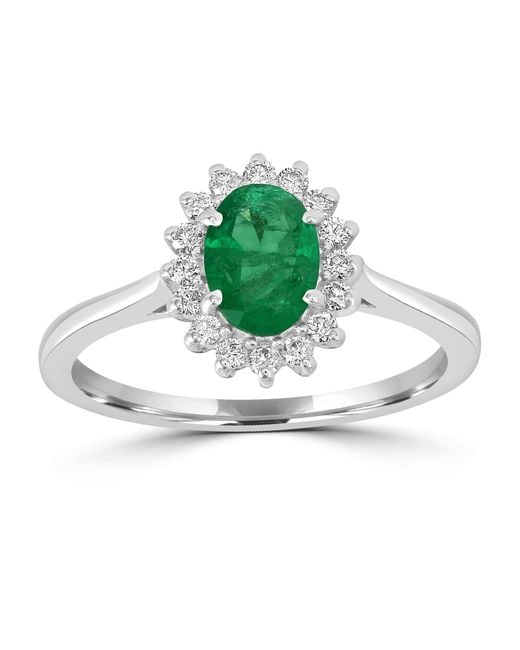 Classic oval emerald ring encircled by a sparkling diamond halo in 18K white gold. Details Metal: 18K White Gold Stones: Natural Emerald( 0. 67 cts) , Natural Diamonds (0. 18 cts) Setting: Prong-Set Design: Floral / Handmade / Cluster / Statement Ring Occasion: Cocktail, Anniversary, Engagement, Fine Jewellery Gift.(AGRG5) This jewellery is made by hand featuring detailed workmanship. Be careful to avoid dropping or banging as physical impacts can result in damage to the pieces including stones falling off. To care for your or jewellery, take caution to keep away from harsh chemicals, Perfume, and Water. You may wipe with a clean polishing cloth to maintain a beautiful shine. Keep in mind that extensive exposure to saltwater, sunlight or harsh chemicals can permanently damage your handmade jewellery. When not in use, keep your jewellery in its box to protect from dust and other debris Colour: green