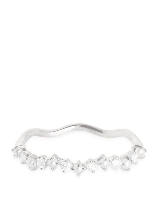 Astrid & Miyu’s moda operandi is simple. Its dainty jewellery is designed to be mixed, matched, layered and stacked, allowing the wearer to create a totally bespoke look that best fits their aesthetic. This ring from the Wave collection is a case in point; crafted from solid white gold, the band wiggles around the finger, while a combination of freshwater pearls and lab-grown diamonds punctuate the front. Colour: white
