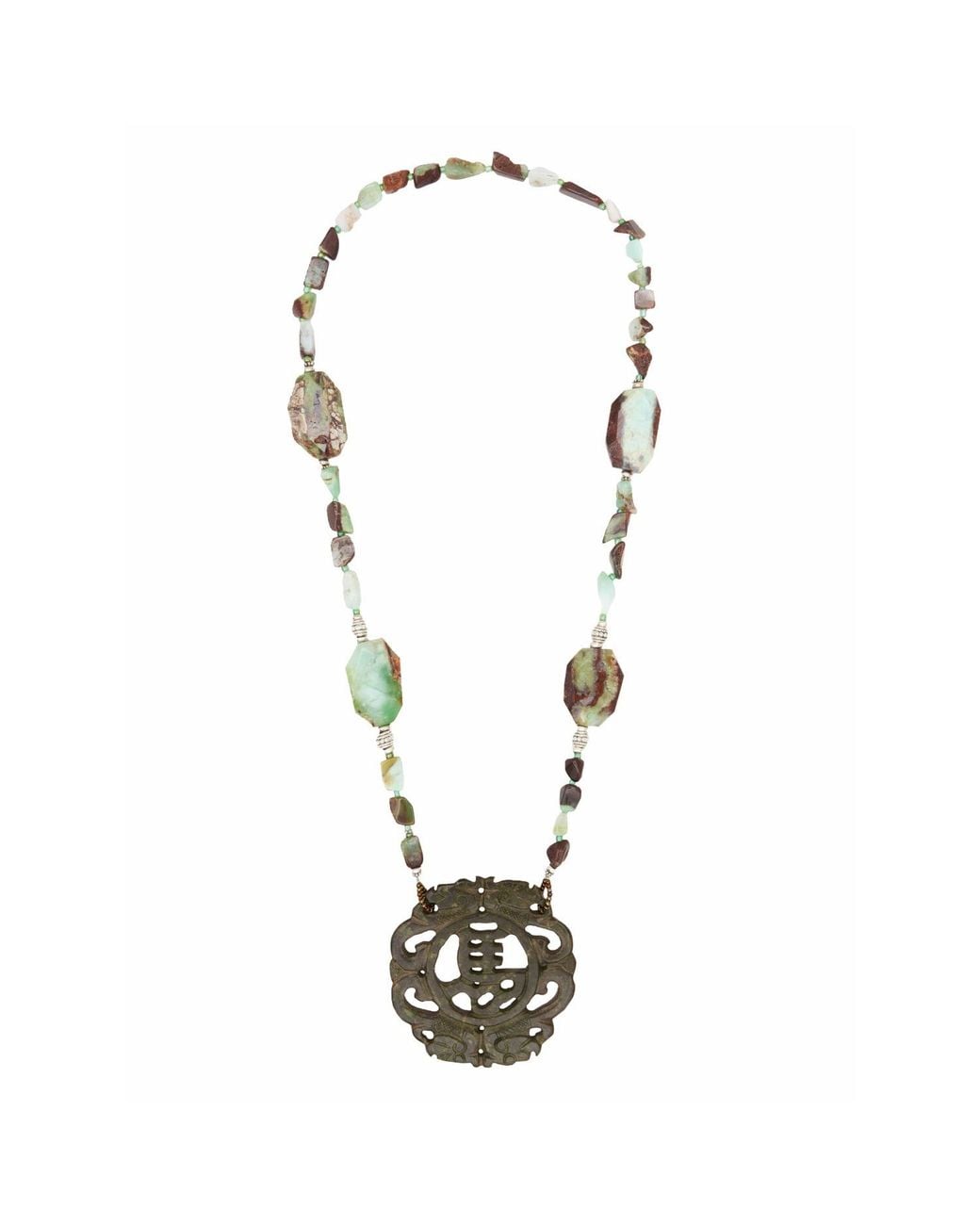 The Satsuki Necklace is a unique piece of oriental inspiration, celebrating the purity of form and the serenity of natural materials. Its focal point is a finely carved jade pendant, evoking tradition and harmony. The piece is completed with chrysoprase gemstones in two distinct cuts, whose soft green hues bring a sense of freshness and balance. The design combines textures and visual rhythm, making it a sophisticated accessory rich in meaning. Total length: 41 cm (including pendant) Circumference: 70 cm Materials: Jade and chrysoprase Handmade in Spain. Jade and chrysoprase (100% natural gemstones) Please, avoid exposing them to harsh chemicals and extreme temperatures. Regularly clean your gemstone jewellery with a soft cloth and mild soap and water. Store your necklace separately to prevent scratching. Colour: metallic