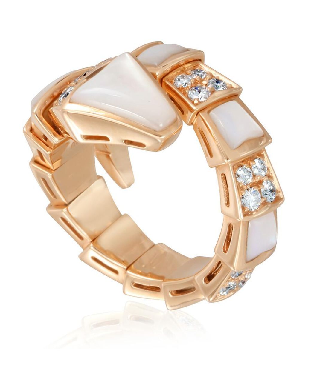 A Bvlgari Serpenti ring crafted in 18K pink gold with mother of pearl inlays and diamond accents. Ref: 350666. Diamonds (Carats): 0.82. The Serpenti Viper One-Coil Ring is a luxurious piece crafted in 18 kt rose gold, designed to elegantly wrap around the finger in Bulgaris signature serpent motif. The ring features pave-set diamonds that add a dazzling brilliance, accentuated by luminous white mother-of-pearl elements for a refined contrast. This combination of precious materials and timeless design evokes the allure and mystery of Bulgaris iconic Serpenti collection, blending sophistication with a touch of boldness. Colour: metallic