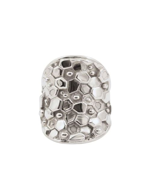 The Silver Hemera Saddle Ring, inspired by the Greek Goddess of sunlight, is created from recycled sterling silver. Its intricate geometric design, enhanced by a granulation technique, captures the light beautifully, giving the illusion of a sparkling effect. The disc measures 3cm in diameter and is available in all UK ring sizes. Each ring is carefully packaged in a luxurious ocean blue matchbox-style jewellery box, embossed with our gold logo, and includes a complimentary polishing cloth to keep it shining. To ensure its longevity, we recommend removing the jewellery when bathing or showering, especially when near salt or chlorine-rich water, as these substances can cause discoloration and damage to the metal. Additionally, it is important to keep your Dainty London jewellery away from extreme heat as the stones may crack. Over time, all silver jewellery can become tarnished and lose its shine due to contact with air and the moisture, acid, and oils found on the skin. To minimise this effect, it is best to store your jewellery in a cool, dry, and dark place in an airtight container. We include a jewellery cleaning cloth with each order to help reduce tarnishing. Occasionally, you may need to clean your jewellery. This can be done with a soft baby's toothbrush and liquid soap. Rub gently in a circular motion until you see the shine return. Colour: white