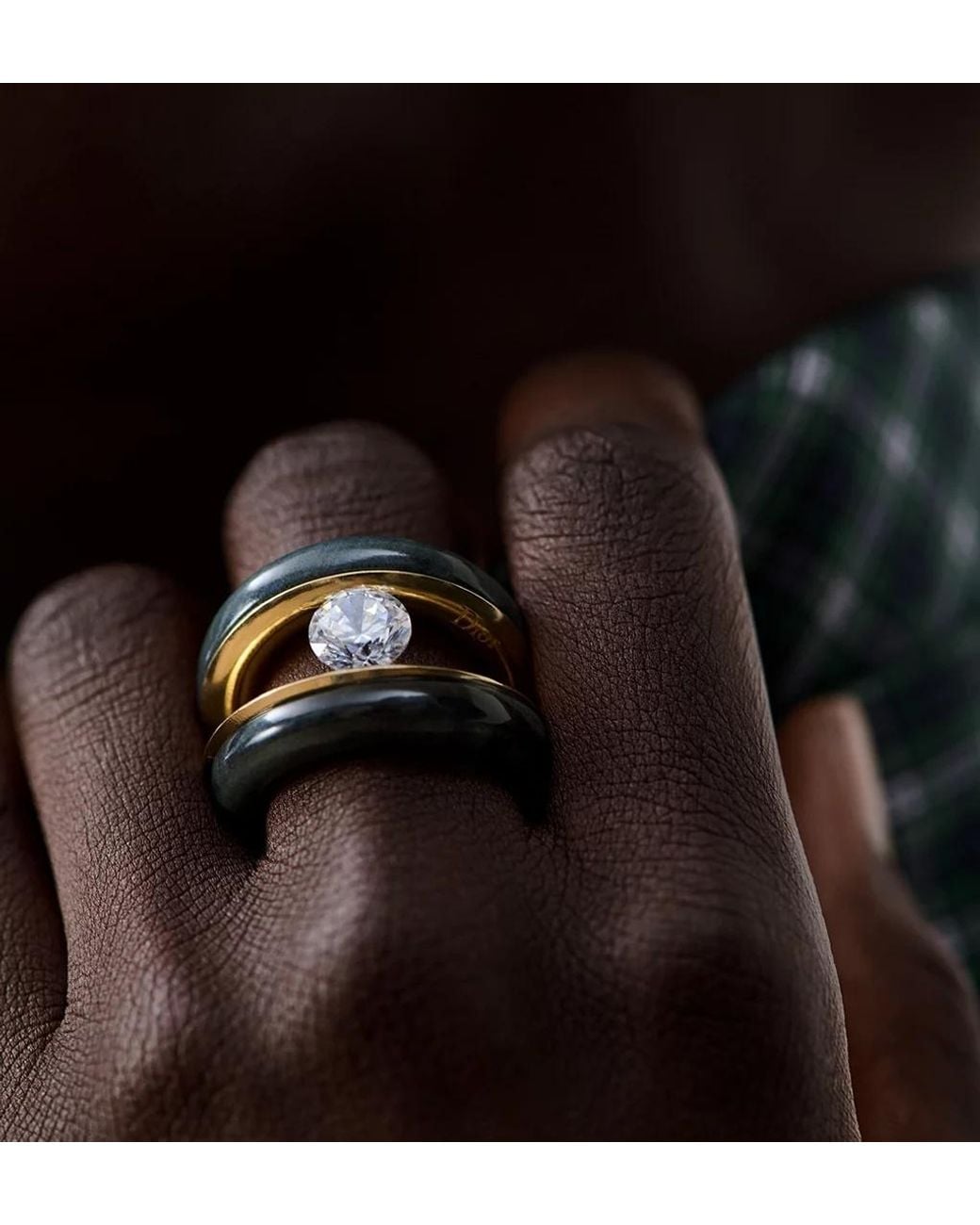 Inspired by the energy of Jonathan Anderson's debut fashion show for the House, the Dior Rocks ring offers a bold and resolutely whimsical aesthetic. The gold-finish metal design is distinguished by the Dior signature and 3D-printed stone-effect resin, meticulously polished to reveal a modern and vibrant radiance in a true reflection of House savoir-faire, while a sparkling crystal at its centre captures the light with intensity. The contemporary creation can be combined with other pieces from the Dior Rocks line. Colour: black