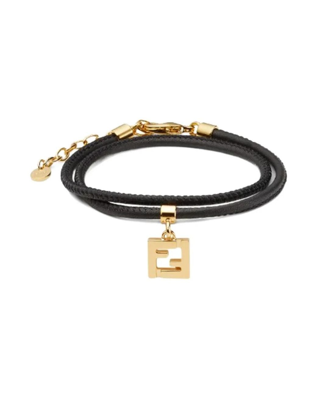 Fendi Forever Leather Bracelet is a double-wrap calfskin piece featuring gold-tone FF hardware for a refined, wearable accent. Key attributes: Black | Gold | Calfskin leather | Double-wrap style | Adjustable clip closure | Small logo tag | Tubular nappa leather strap | Gold-tone metal details | FF logo charm | Dimensions & fit: Length (min): 34 cm | Length (max): 39 cm | Adjustable fit | Double-wrap fit (wraps twice around the wrist) | Composition & care: 100% calfskin | 100% brass | Avoid contact with sea water, spa water, perfumes, solvents and abrasive materials. Clean with water and neutral soap if necessary and polish with a dry microfiber cloth. Colour: metallic