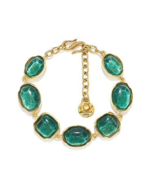 Gold-tone/deep lake blue 24kt gold plated brass natural rock crystal cabochon gemstone cable-link chain logo pendant adjustable fit Size: One Size. Gender: Unisex. Material:Natural Rock Crystal/24kt Gold Plated Brass. Colour: green