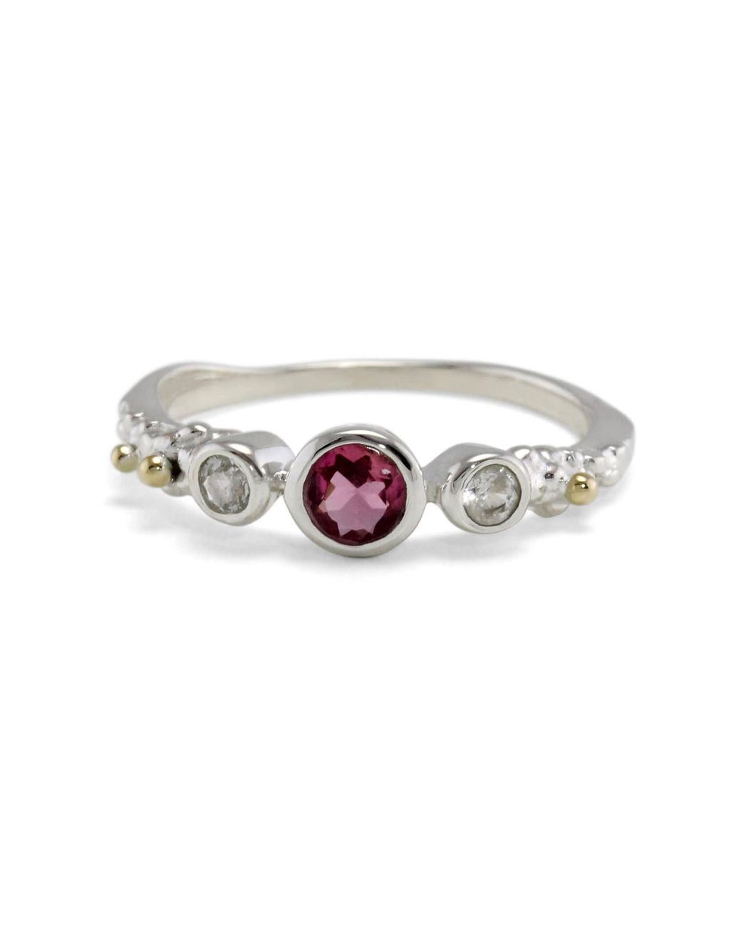 Handmade from Sterling Silver, this dainty ring features a sparkling Pink Tourmaline nestled amongst two White Topaz gemstones. This October birthstone ring is a thoughtful gift for anyone who has a dainty and elegant style. We love wearing it as a stacking ring for a perfect layered look. Designed in our Devon studio, our ring is handcrafted with the utmost care and comes packaged in our Isla Silver gift box, adding a touch of luxury and making it the perfect gift. Materials: Sterling Silver, Pink Tourmaline, White Topaz, Brass Care and Materials Isla Silver has designed your jewellery to be enjoyed for many years to come. To maintain your silver/gold’s shine, wipe gently with a silver polishing cloth. Avoid wearing your jewellery in the bath and while swimming. Prevent contact with products that may cause your jewellery to tarnish. To protect your jewellery when it’s not being worn, store in an airtight container. Colour: white