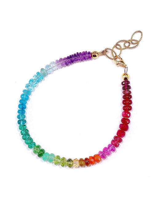 This brilliant and colourful bracelet is made of precious and rare natural gemstones, arranged to form a rainbow: Amethyst, Aquamarine, Blue Topaz, Blue Apatite, Green Apatite, Green Tourmaline, Chrysoprase, Peridot, Citrine Quartz, Carnelian, Pink Sapphire, Pink Tourmaline, Ruby, Garnet, Smoky Quartz and Labradorite. This rainbow bracelet features gemstones known for their healing properties. They promote vitality, creativity, and emotional healing, balance energy, clear blockages, boost confidence, and foster inner peace. A symbol of harmony, it supports both physical and emotional well-being. All Mineralgemsstudio jewellery is designed and hand-crafted in Italy and comes with a Certificate of Authenticity. Natural gemstones with 18-carat gold-plated sterling silver lobster clasp and chain. Hand wash in cold water. Colour: pink