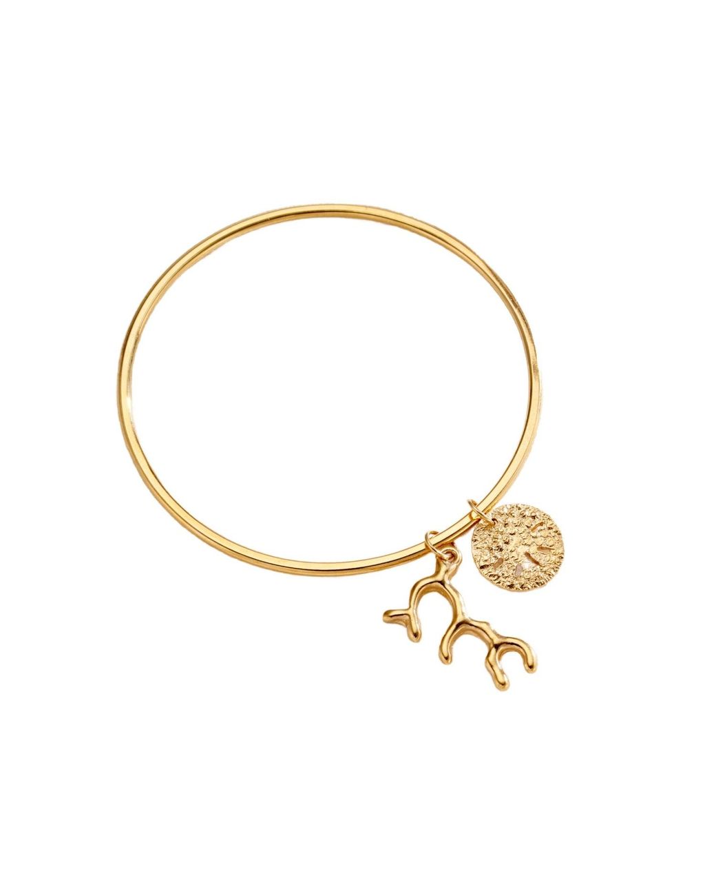 The Posh Totty Designs Seashell Charm Bangle features a 18ct yellow gold plated sterling silver Sand Dollar shell and piece of Coral suspended on a sleek bangle. The organic curves of the shells are pleasingly tactile. Shells are evocative of happy times spent with loved ones, and this gorgeous bangle will transport you to those balmy beaches and heartwarming memories. The bangle is inspired by an actual tidal Cowrie shell from Tulum, Mexico. Handmade by our jewellers in Brighton in 925 sterling silver then plated in 18ct yellow gold. Made from 18ct Gold plated sterling silver Dimensions: Bangle is 6. 5cm diameter. Coral charm measures 2. 8cm Length, 2. 5cm width, 3mm thickness. Made from 18ct Gold plated sterling silver. Colour: metallic