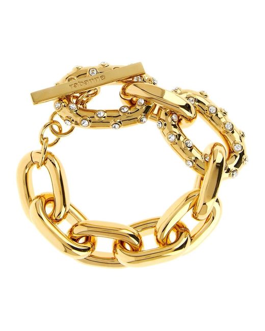 Rabanne XL Link Chain Bracelet is a statement bracelet that pairs oversized woven metal links with crystal detailing. Designed for bold, adjustable styling, it fastens with a hook closure for easy wear. Key attributes: Yellow | Gold | Metal | Adjustable length | Hook closure | Wide woven metal links | Crystal application | XL link chain silhouette | Dimensions & fit: Adjustable fit Colour: metallic