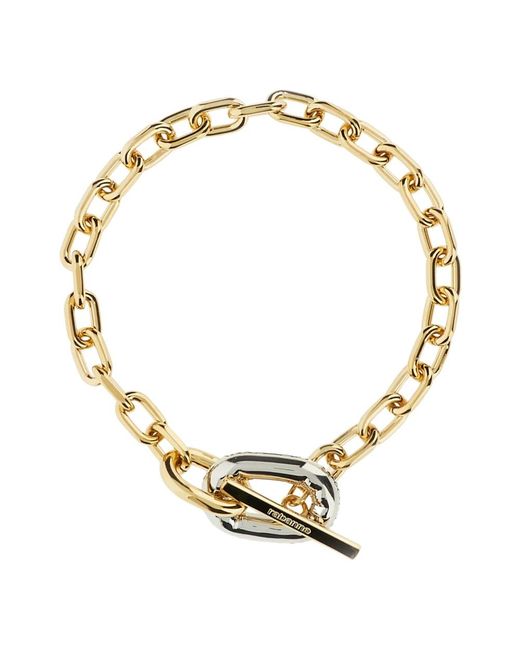 Rabanne Thick Chain Bracelet is a bold metal accessory featuring oversized oval links and a glossy finish. Its T-bar toggle closure makes it easy to wear while adding a statement touch to both day and evening looks. Key attributes: Yellow | Golden | Aluminium and Brass | T-bar toggle closure | Oval links | Thick chain | Glossy finish | Dimensions & fit: One size | Composition & care: 50% Aluminium | 50% Laiton (Brass) Colour: metallic