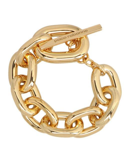 Rabanne XL Link Bracelet is a bold chain bracelet defined by oversized interlocking links and a logo-embossed T-bar clasp, designed as a standout everyday accessory. Key attributes: Yellow | Gold | Brass | T-bar fastening | Logo clasp | XL interlocking links | Chain bracelet | Bold link design | Composition & care: 100% Brass Colour: metallic