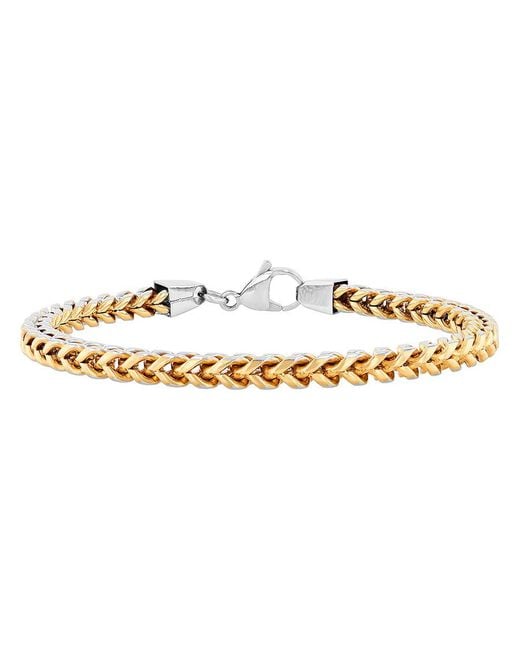 Handsome and hardy, this stainless steel mens Franco chain bracelet is ready to take on any adventure with you. This mens link bracelet, measuring 5.5MM wide, 5.5MM thick, and 8.75 long, is ready to electrify your jewellery collection. Robert Alton Mens Bracelets. SKU: TS15525. Barcode: 195091034383. Color: Two-tone. Metal Type: Stainless Steel. Metal Stamp: No Stamp. Gem stone type: None. Bracelet style: Link. Closure type: Lobster. Robert Alton Mens Franco Chain Bracelet. Colour: metallic