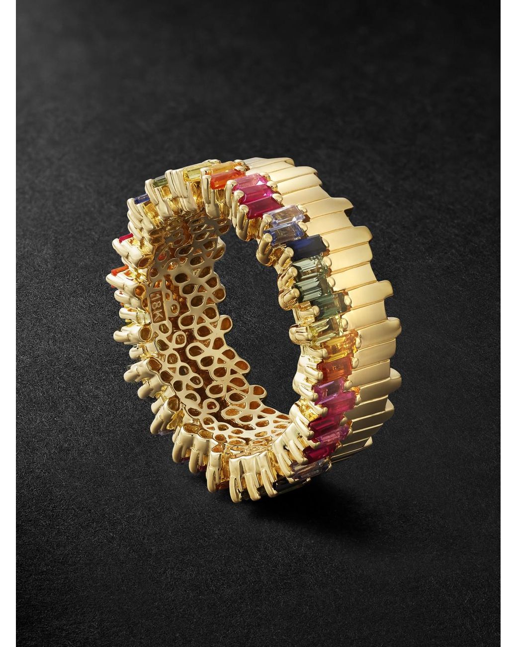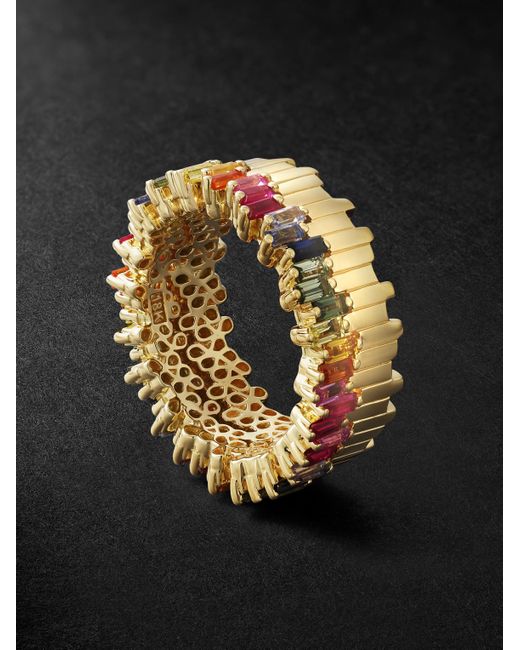 Suzanne Kalan creates timeless pieces that are made to live on for generations. Handcrafted in Los Angeles, this mesmerising 18-karat gold eternity ring is set with 3.20-carats of baguette-cut rainbow sapphires. Colour: black