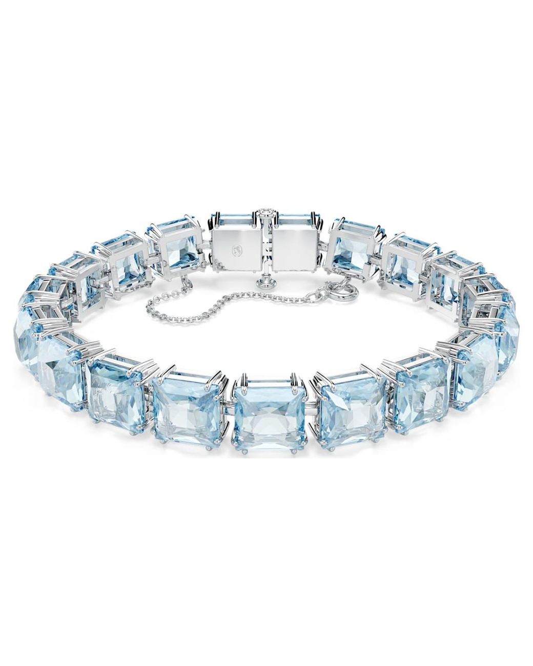 Add a shot of geometric colour to any look with this striking, everyday Tennis bracelet. With a concealed fastening and sleek, rhodium-plated frame, it allows the vibrant, aquamarine, square-cut crystals to steal the spotlight. Wear yours solo over a cuff for a uniquely chic statement, day or night. This Tennis bracelet is part of the Millenia family, designed by Creative Director Giovanna Engelbert for Collection II. How to close and open it: slide the hooks into the corresponding holes at the base of the end stone and push to click into place. Fasten the security chain using the small lever clasp. To open, unfasten the security chain and press the buttons on either side of the stone at the same time to release the hooks.