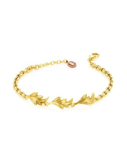 The Lilium Bracelet in 18K gold vermeil radiates warmth and elegance inspired by the enduring beauty of the natural world. Its trio of finely sculpted leaves flows gracefully along the wrist, catching the light with every movement and enhancing the richness of the gold finish. Crafted in Italy through the traditional lost-wax casting technique, this bracelet combines artisanal heritage with contemporary sophistication. The gold vermeil coating highlights the organic contours of each leaf while preserving the tactile quality of the hand-finished surface, resulting in a piece that feels both luxurious and authentic. Leaves have long symbolized renewal, vitality, and inner strength. This Unaloe bracelet is handcrafted in Italy using 925 sterling silver, created through the ancient lost-wax casting technique and finished by skilled artisans. The design features sculpted botanical leaf elements linked by a refined chain, ensuring comfort, durability, and refined elegance. Material & Finish Care Sterling Silver version: finished with an artisanal brunishing process to enhance depth, contrast, and handcrafted texture. Gold Vermeil version: coated with 18K gold vermeil (1 micron thickness) over a protective palladium layer, designed to reduce oxidation and extend the life of the gold finish. How to care for your jewellery Avoid contact with water, perfumes, cosmetics, lotions, detergents, and chlorine Remove before showering, swimming, exercising, or sleeping Store in the original Unaloe pouch, away from humidity and direct sunlight Clean gently only when necessary using a soft suede or microfiber cloth Do not use abrasive cleaners, ultrasonic devices, or chemical solutions Natural variations in finish, tone, or texture are a hallmark of handcrafted jewellery and part of its unique character. Standards & Compliance All Unaloe jewellery is nickel-free, hypoallergenic, and fully compliant with EU REACH and RoHS regulations. PROCESSING: Made in Italy - Quality Certification WEIGHT : 7, 00 gr. MATERIAL: Silver Sterling 925 - 14K rose gold plating* SUSTAINABLE : Our company's goal is to be an environmentally friendly brand, aimed at an eco-sustainable future. Colour: metallic