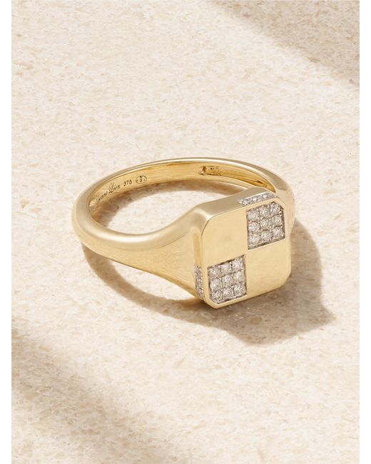 Yvonne Léon's flair for vintage jewellery is beautifully showcased in all her pieces. This signet ring or chevalière is handmade from 9-karat gold and set with 0.12-carats of diamonds in a geometric pattern. Colour: natural