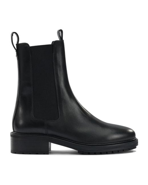 Aeyde's Jack Chelsea Boots pair a compact, squared profile with a durable treaded sole for reliable everyday wear. The design balances a clean, smooth upper with practical details for easy on-and-off. Key attributes: Black | Calf leather | Treaded rubber outsole for grip and durability | Elasticized side panels | Back and front pull tabs for easy entry | Wide, sturdy heel for stability | Compact squared profile | Smooth upper with clean silhouette | Stacked midsole and block heel | Dimensions & fit: Heel height: 4.5 cm | Shaft height: 18 cm | Calf circumference: 28 cm | Composition & care: Outside: 100% Calf leather | Inside: 100% Cross breed lamb leather | Outsole: 100% Tread rubber