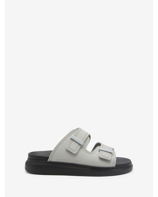 Rubber hybrid slide in ash grey featuring two straps with tonal bar slides, each engraved with an alexander mcqueen signature. The slide is finished with an oversized rubber sole. Colour: white
