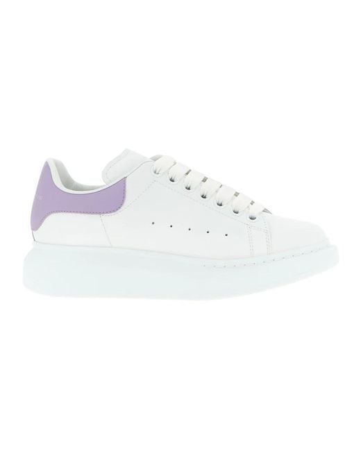 Alexander Mc Queen Larry Leather Trainers pair a bold oversized rubber sole with a contrasting heel for a statement streetwear look. Crafted in calfskin leather, they offer a fashion-forward silhouette suited to everyday wear. Key attributes: White | Purple | Calfskin leather | Lace-up closure | Padded collar | Contrast heel tab | Back embossed logo | Oversized rubber sole | Round toe | Dimensions & fit: Oversize fit — consider sizing down ½ to 1 size. | Composition & care: 100% calfskin leather (upper) | Rubber sole Colour: white