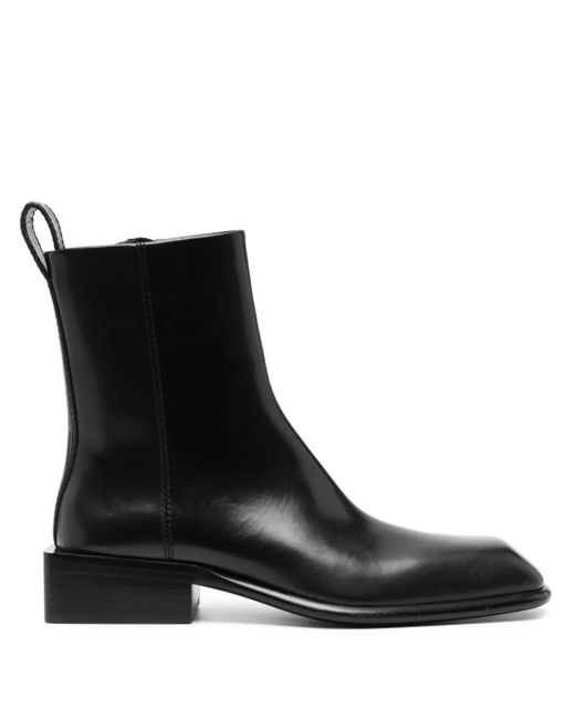 Black calf leather smooth grain side zip fastening block heel silver-tone logo plaque pull-tab at the heel square toe branded leather insole leather sole Size: 37.5. Gender: Female. Material:Calf Leather/Rubber/Calf Leather/Calf Leather/Metal.