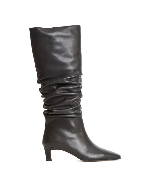 Alohas Kalila Boots pair a low 5 cm kitten heel with an elongated square toe and a ruched shaft for a refined everyday look. The design balances a sculpted silhouette with wearable comfort. Key attributes: Black | Nero | Leather | Leather lining | Cuerolite outsole | Elongated square toe | Ruched (wrinkled) shaft | Kitten heel | Dimensions & fit: Heel height: 5 cm | Calf width: 39.0 cm (Size 38) | Fits true to size; take your normal size. | Composition & care: Upper: 100% Cow Leather | Lining: 100% Cow Leather | Insole: 100% Cow Leather | Outsole: 100% Cuerolite Colour: grey