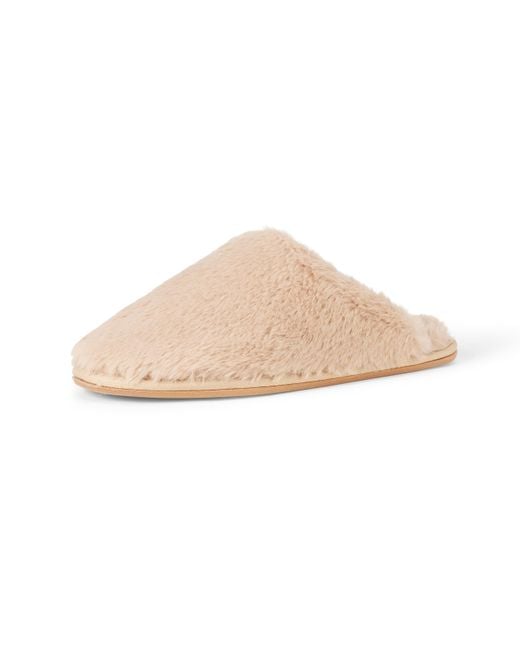 COMFORT AND FIT: These cosy, fuzzy, slip-on house slippers have a soft foam insole for added comfort MATERIAL: Amazon Essentials footwear is made from high-quality materials. This style is made out of a soft faux fur STYLE: These women's slippers feature a modern mule silhouette DESIGN: These cosy house slippers for women pamper your feet and pair well with Amazon Essentials pyjamas or loungewear. Colour: natural