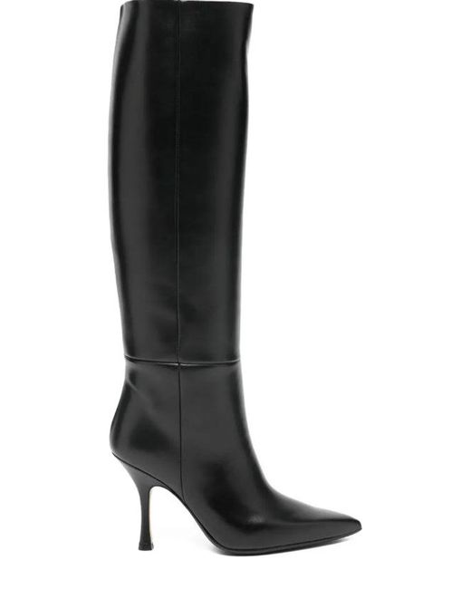 Anna F's pointed-toe boot is crafted from soft black calfskin. It features a 10-centimeter leather-covered stiletto heel. The shaft is approximately 43 centimeters high (based on a size 38). Colour: black